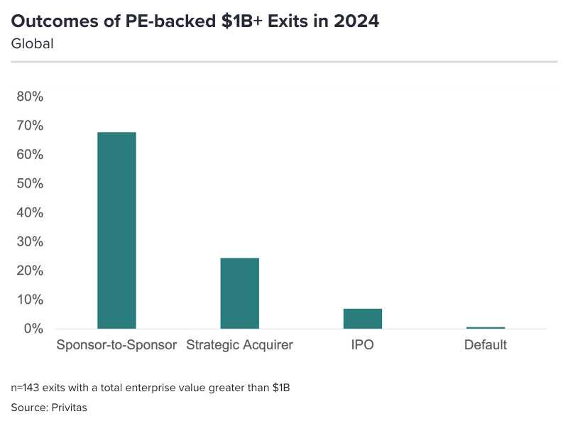“We saw a lot of mega fund exits in 2024 that weren’t wild success stories,” says Cooper Smith, managing director of Privitas. “PE firms typically like to see the enterprise value of portfolio companies double over the holding period. However, out of the 143 $1B+ exits last year, 51 companies reported less than double growth to their enterprise value over the holding period, with six companies actually reporting a decline.”